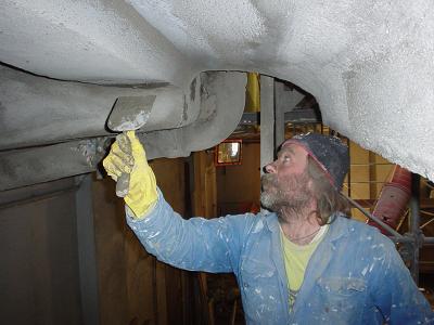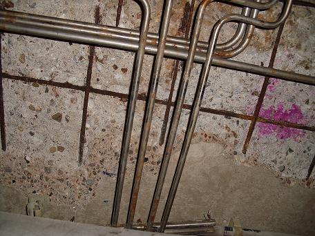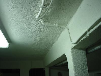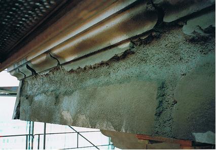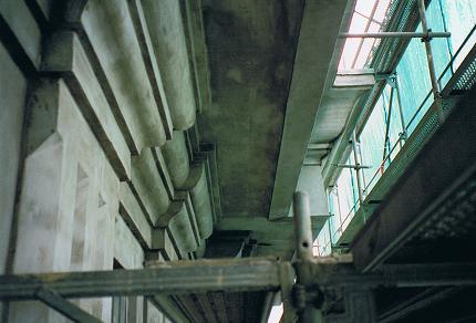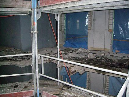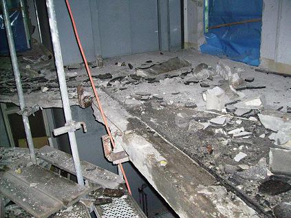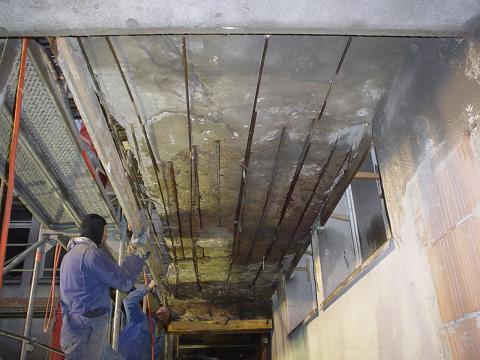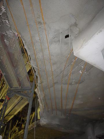An den schadhaften Deckenbereichen wurde eine Betoninstandsetzung durchgeführt , im gesamten Deckenbereich sowie Unterzüge wurde die Tiefe der Bewehrung gemessen und wo nötig auf die erforderliche Schicht ( 3cm ) mit Spritzbeton verstärkt.