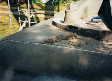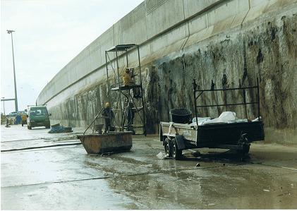 Die Schadstellen wurden von uns gestemmt , sandgetrahlt , fehlende Eisen erneuert und mit Spritzbeton B 25 reprofiliert , kommplett mit Betonspachtel überzogen grundiert und 3 mal beschichtet