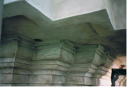 Das rot makierte Feld zeigt den Betonstuck im Turmbereich der St. Michaeliskirche